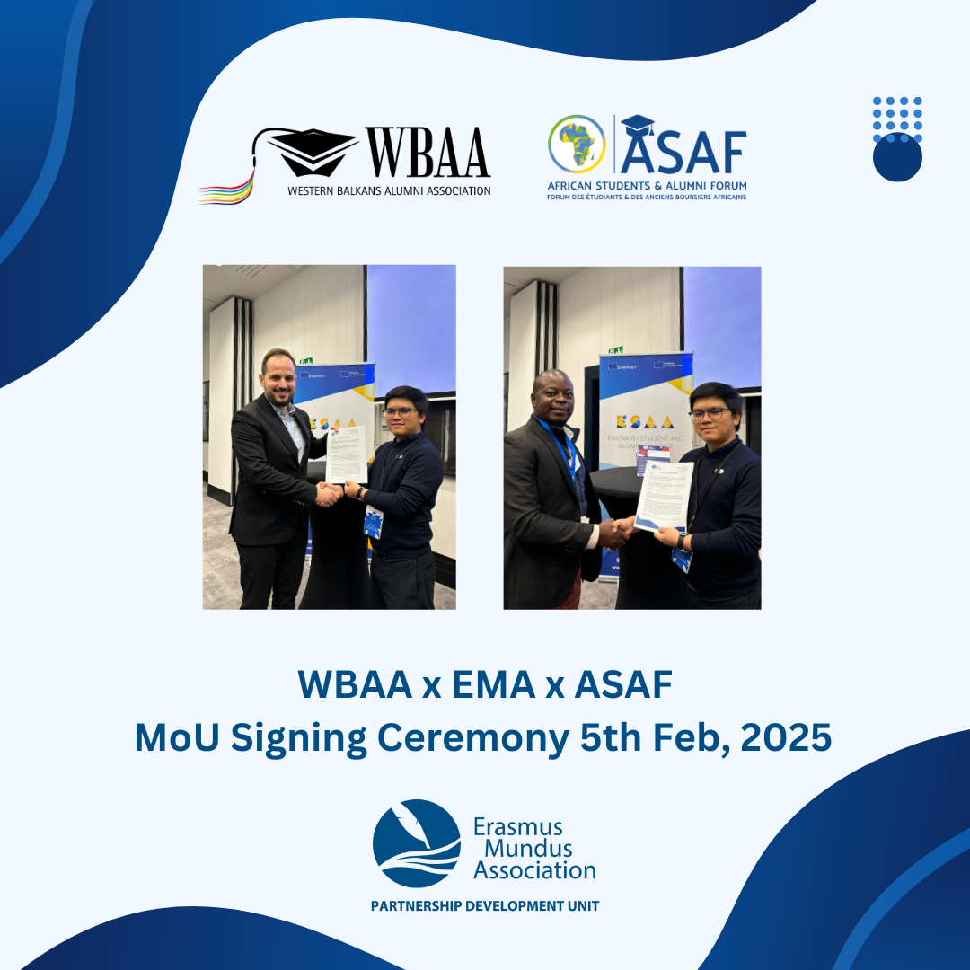 The African Student and Alumni Forum (ASAF), the Erasmus Mundus Association (EMA), and the Western Balkans Alumni Association (WBAA) have signed a Memorandum of Understanding (MoU) during the NEO-ENFP-ICP meeting in Brussels, Belgium, on 5 February 2025. This agreement aims at strengthening cooperation across different regions between the organisations under the umbrella of Erasmus+ Students and Alumni Alliance (ESAA).